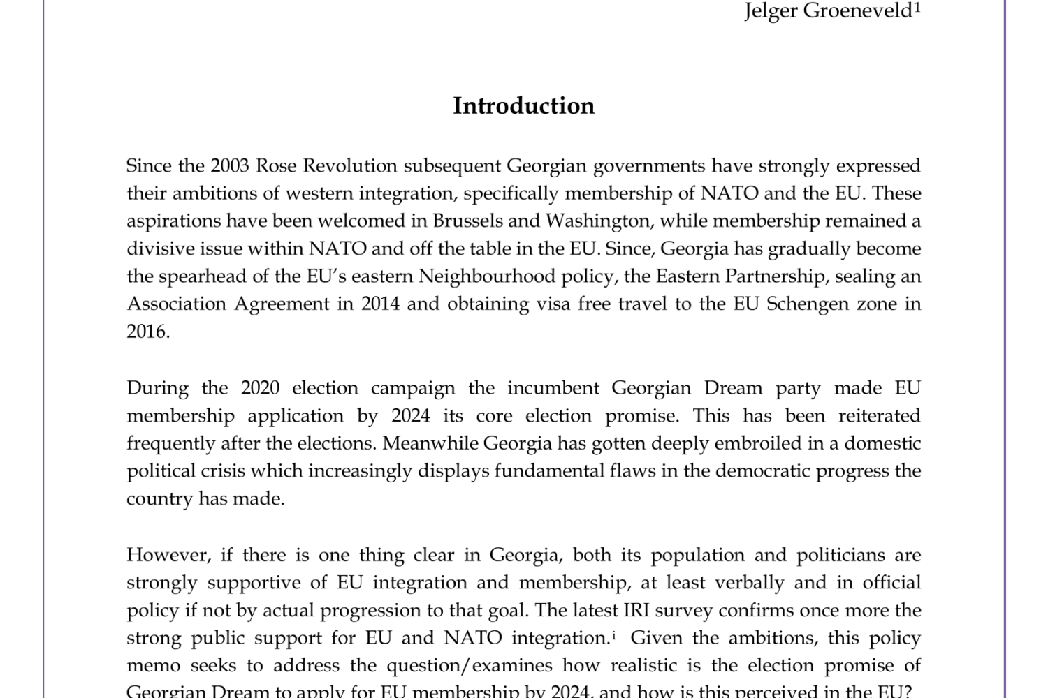However, if there is one thing clear in Georgia, both its population and politicians are strongly supportive of EU integration and membership, at least verbally and in official policy if not by actual progression to that goal. The latest IRI survey confirms once more the strong public support for EU and NATO integration.[i]  Given the ambitions, this policy memo seeks to address the question/examines how realistic is the election promise of Georgian Dream to apply for EU membership by 2024, and how is this perceived in the EU?