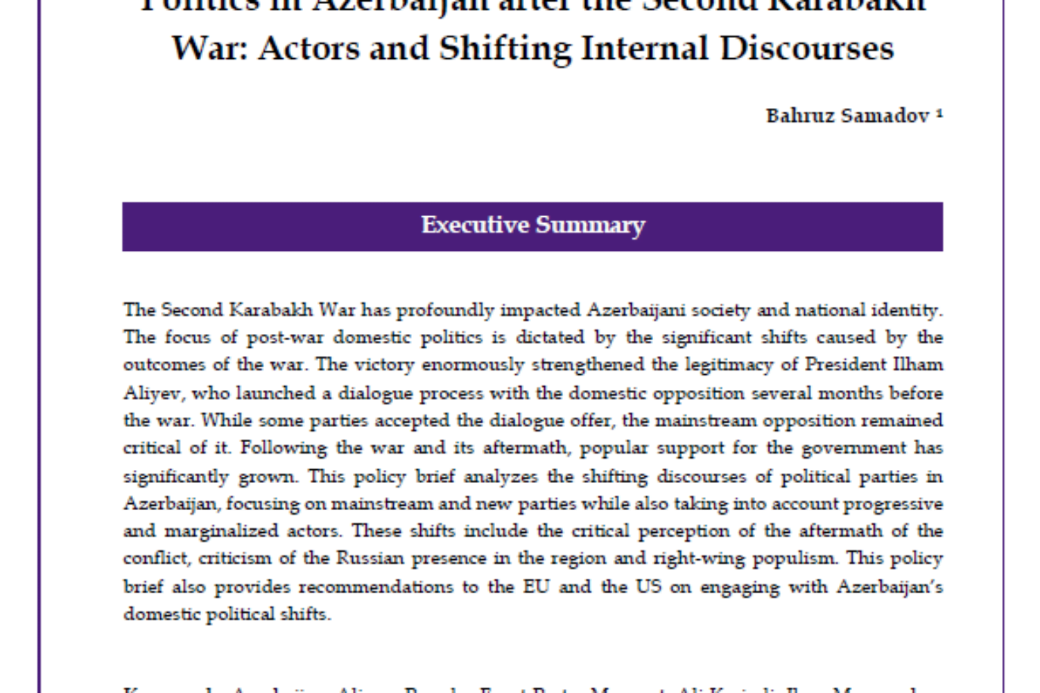 The Second Karabakh War has profoundly impacted Azerbaijani society and national identity. The focus of post-war domestic politics is dictated by the significant shifts caused by the outcomes of the war. The victory enormously strengthened the legitimacy of President Ilham Aliyev, who launched a dialogue process with the domestic opposition several months before the war. While some parties accepted the dialogue offer, the mainstream opposition remained critical of it. Following the war and its aftermath, popular support for the government has significantly grown. This policy brief analyzes the shifting discourses of political parties in Azerbaijan, focusing on mainstream and new parties while also taking into account progressive and marginalized actors. These shifts include the critical perception of the aftermath of the conflict, criticism of the Russian presence in the region and right-wing populism. This policy brief also provides recommendations to the EU and the US on engaging with Azerbaijan’s domestic political shifts.