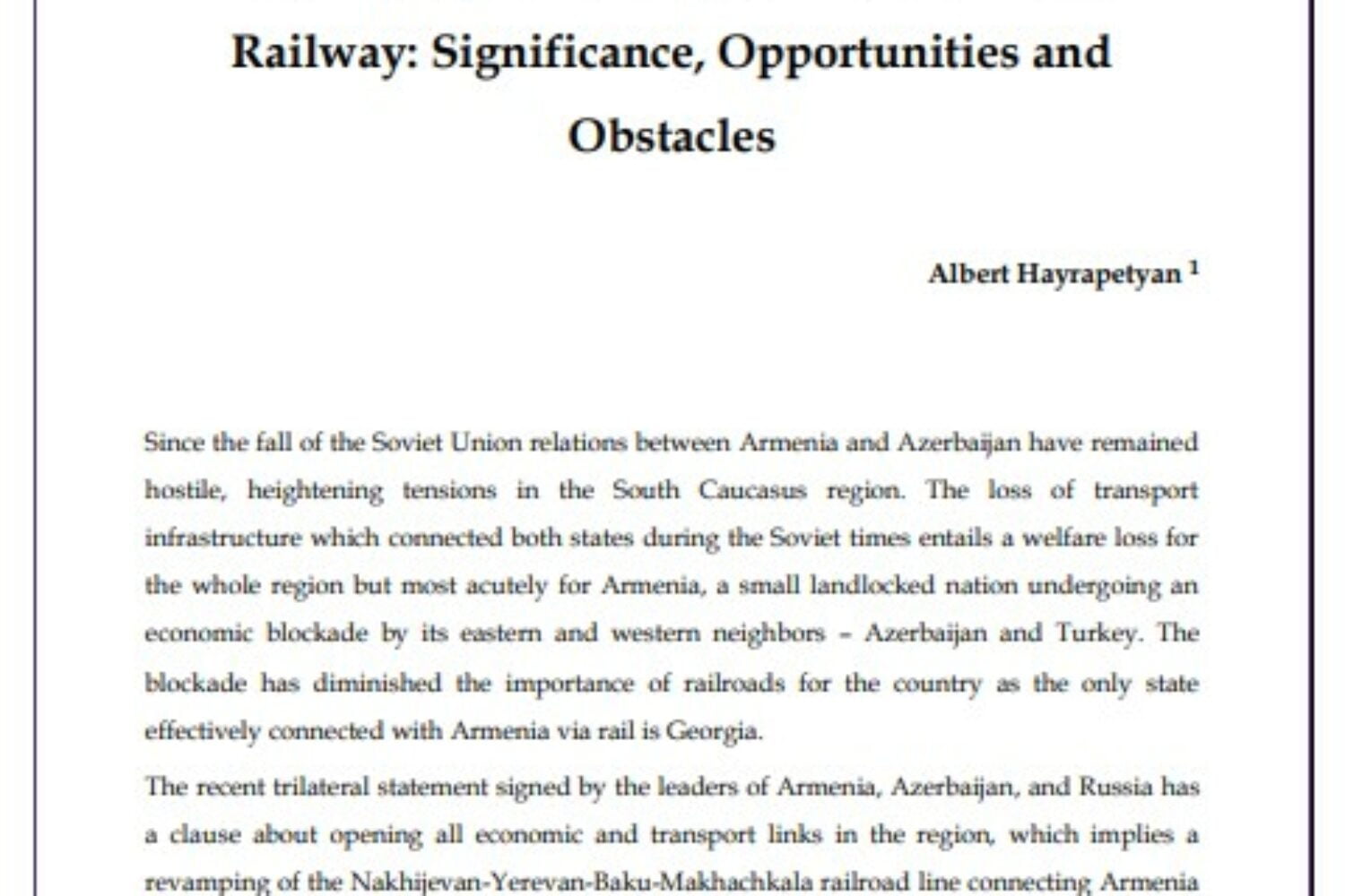 A comprehensive estimation of the benefits to the region from opening the railroad for the would be challenging to summarize in such a short paper. Therefore, this paper will focus on the importance of the railroad for Armenia only. The paper also examines a possible solution to the stalemate resulting from the arbitrary interpretation of the 9th point of the trilateral statement which refers to the unblocking of all economic and transport links.