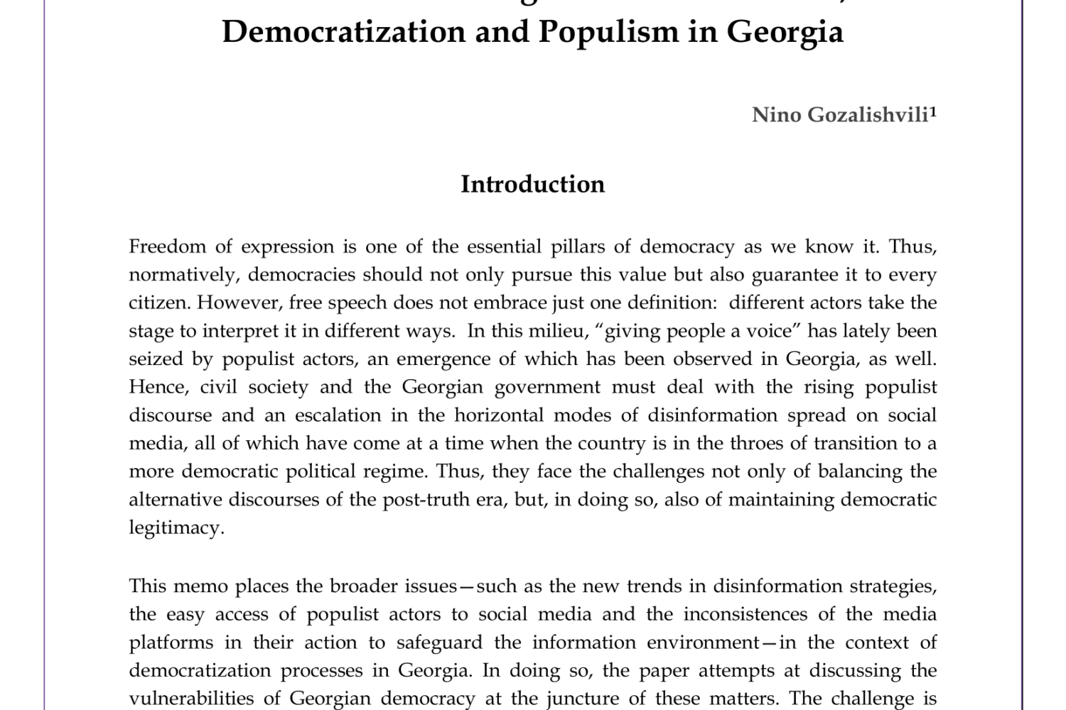 Freedom of expression is one of the essential pillars of democracy as we know it. Thus, normatively, democracies should not only pursue this value but also guarantee it to every citizen. However, free speech does not embrace just one definition:  different actors take the stage to interpret it in different ways.  In this milieu, “giving people a voice” has lately been seized by populist actors, an emergence of which has been observed in Georgia, as well. Hence, civil society and the Georgian government must deal with the rising populist discourse and an escalation in the horizontal modes of disinformation spread on social media, all of which have come at a time when the country is in the throes of transition to a more democratic political regime. Thus, they face the challenges not only of balancing the alternative discourses of the post-truth era, but, in doing so, also of maintaining democratic legitimacy.
