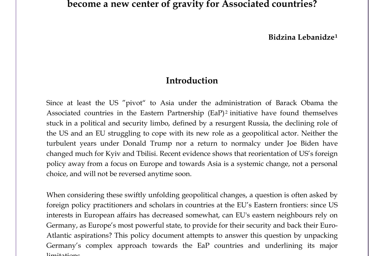 When considering these swiftly unfolding geopolitical changes, a question is often asked by foreign policy practitioners and scholars in countries at the EU’s Eastern frontiers: since US interests in European affairs has decreased somewhat, can EU’s eastern neighbours rely on Germany, as Europe’s most powerful state, to provide for their security and back their Euro-Atlantic aspirations? This policy document attempts to answer this question by unpacking Germany’s complex approach towards the EaP countries and underlining its major limitations.