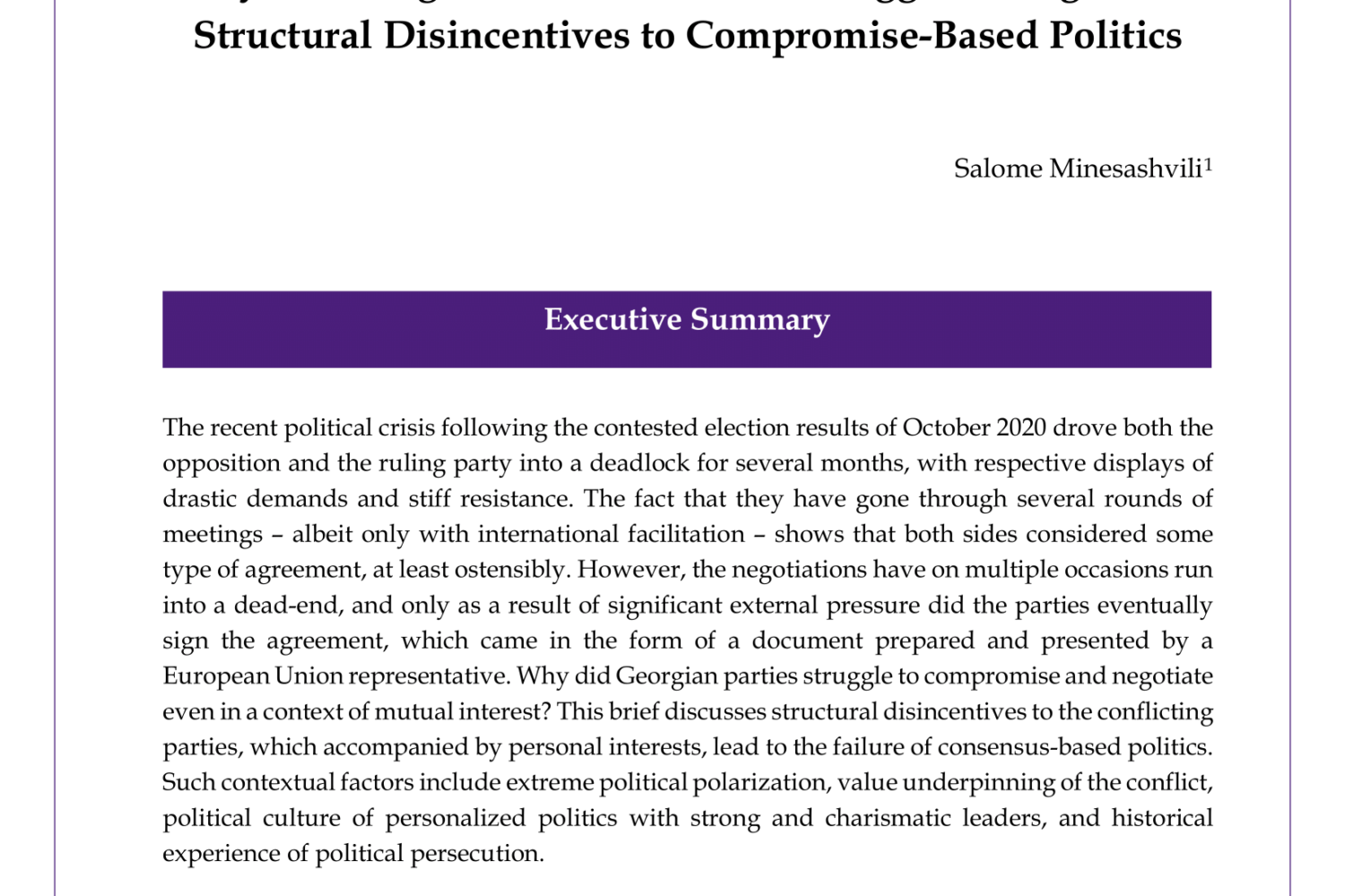 The recent political crisis following the contested election results of October 2020 drove both the opposition and the ruling party into a deadlock for several months, with respective displays of drastic demands and stiff resistance. The fact that they have gone through several rounds of meetings – albeit only with international facilitation – shows that both sides considered some type of agreement, at least ostensibly. However, the negotiations have on multiple occasions run into a dead-end, and only as a result of significant external pressure did the parties eventually sign the agreement, which came in the form of a document prepared and presented by a European Union representative. Why did Georgian parties struggle to compromise and negotiate even in a context of mutual interest? This brief discusses structural disincentives to the conflicting parties, which accompanied by personal interests, lead to the failure of consensus-based politics. Such contextual factors include extreme political polarization, value underpinning of the conflict, political culture of personalized politics with strong and charismatic leaders, and historical experience of political persecution.