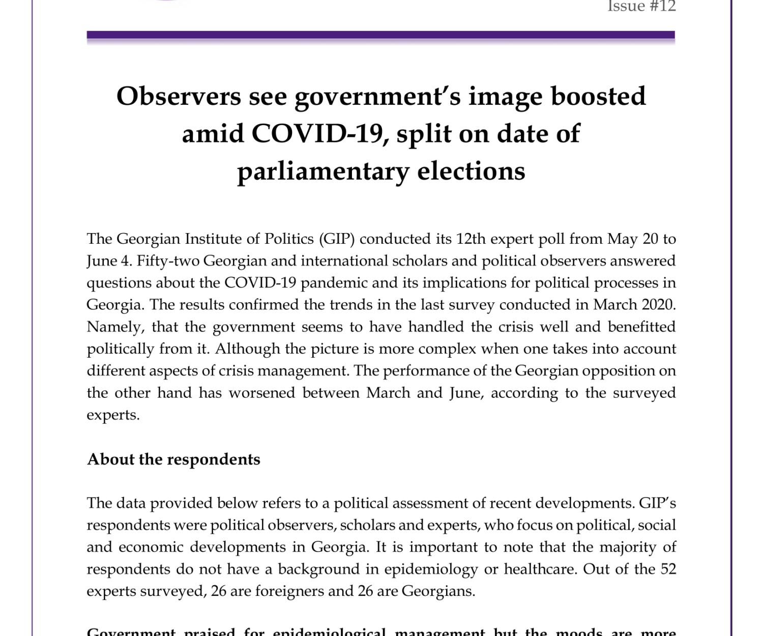 Uncategorized 11 Jun 2020 Observers see government’s image boosted amid COVID-19, split on date of parliamentary electionsGIP Expert Polls / Issue #12 GIP