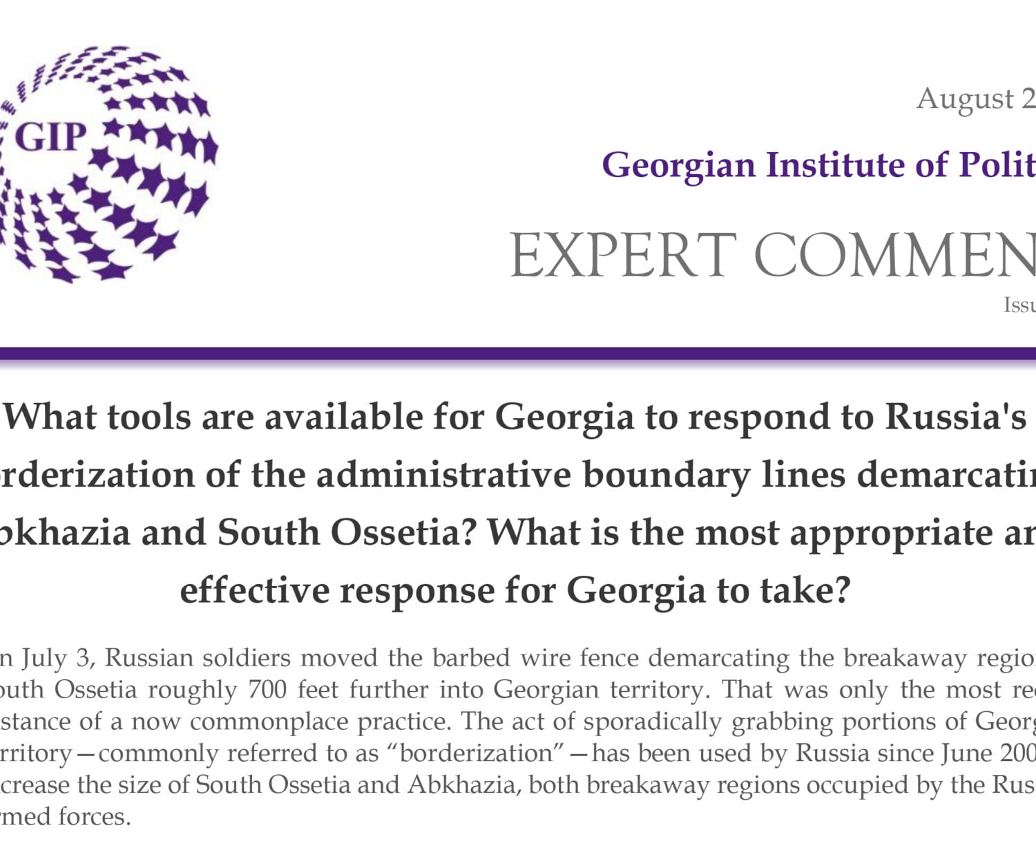 Uncategorized 14 Aug 2017 How Should Georgia Respond to Russia’s Borderization?What tools are available for Georgia to respond to Russia’s borderization of… GIP