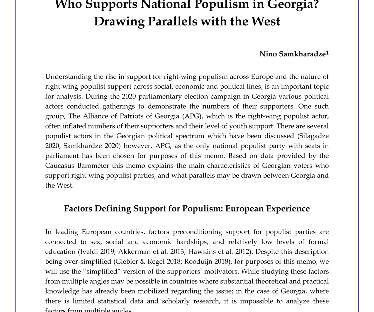 Uncategorized 28 Jan 2021 Who Supports National Populism in Georgia? Drawing Parallels with the WestUnderstanding the rise in support for right-wing populism across Europe and the… Nino Samkharadze