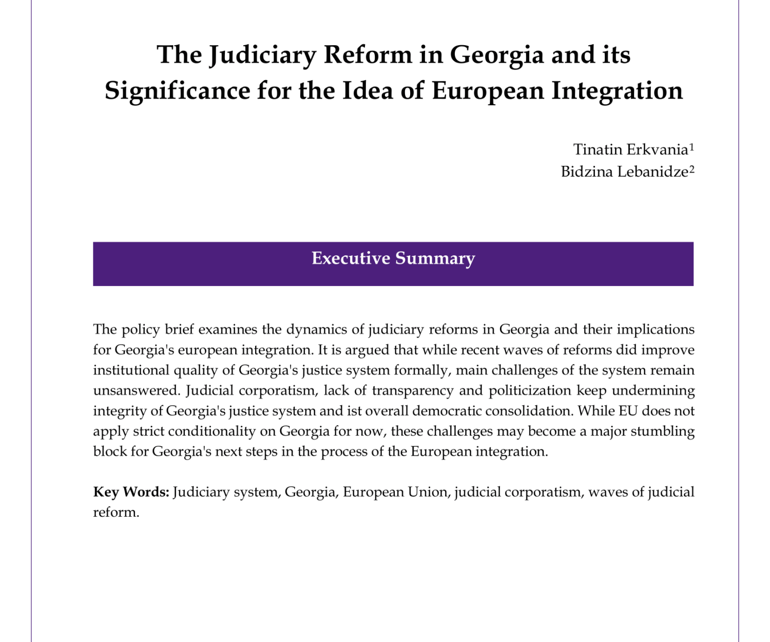 Uncategorized 29 Jan 2021 The Judiciary Reform in Georgia and its Significance for the Idea of European IntegrationThe efficient functioning of the judiciary and justice system remains the Achilles’… Bidzina Lebanidze