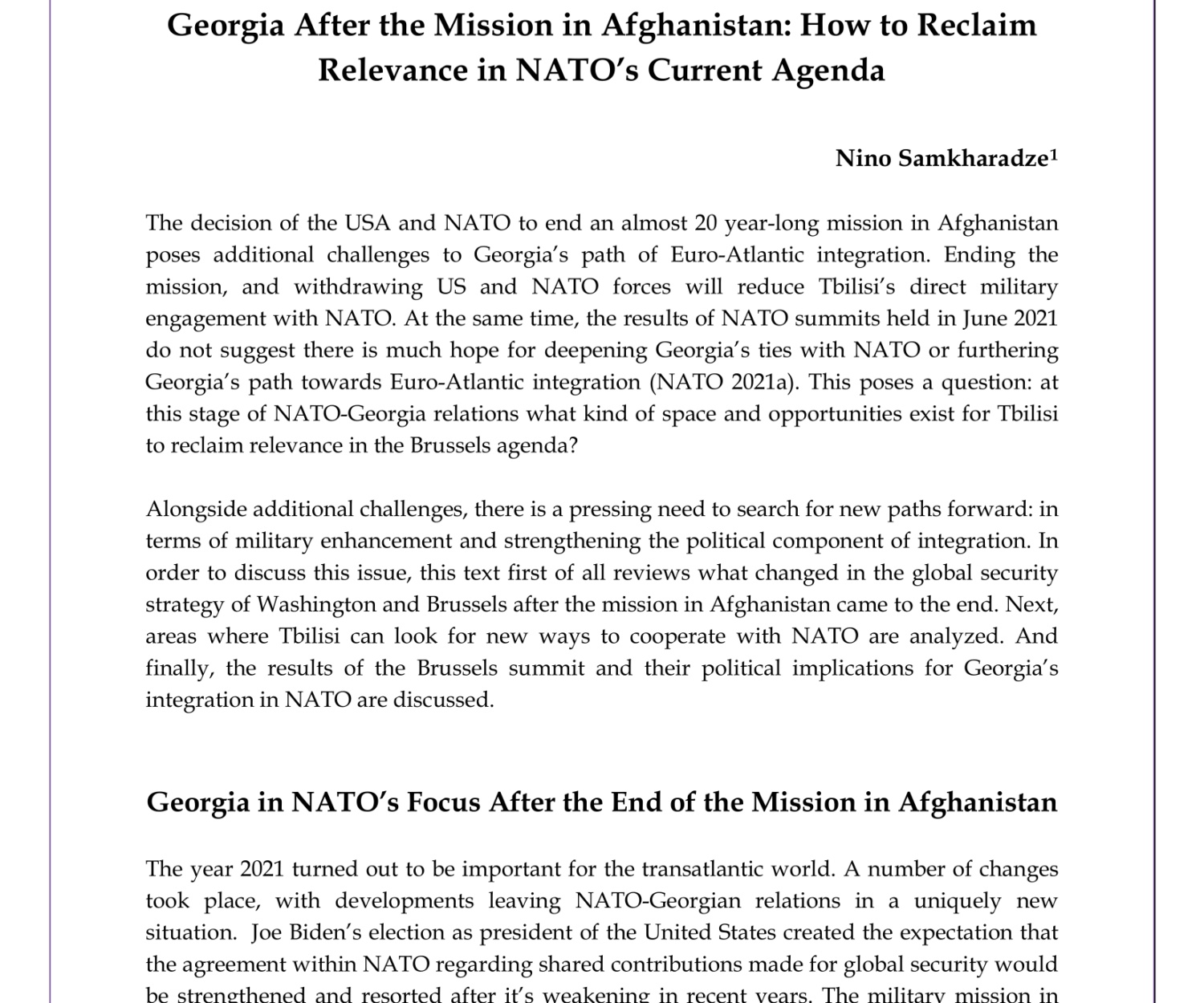 Uncategorized 22 Jul 2021 Georgia After the Mission in Afghanistan: How to Reclaim Relevance in NATO’s Current AgendaGeorgia’s Current Path to Democracy: Where Do We Stand and How Should… Nino Samkharadze